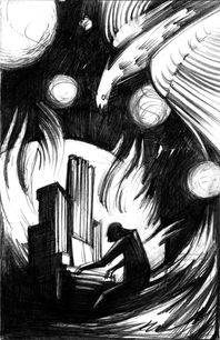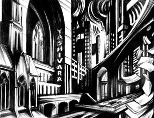These scenes have been given special attention in this volume and have been rendered in the German Expressionist style by Elijah John who's work here is influenced by the great graphic artists of that period, Albin Grau (Nosferatu), Stefan Eggeler, Edvard Munch and Alfred Kubin. These illustrations set against the crisp, sharpness of Zimakov's linocuts, the exquisite play of dark and light of which he is a master, are intended to visually mirror the two distinct worlds of Metropolis.